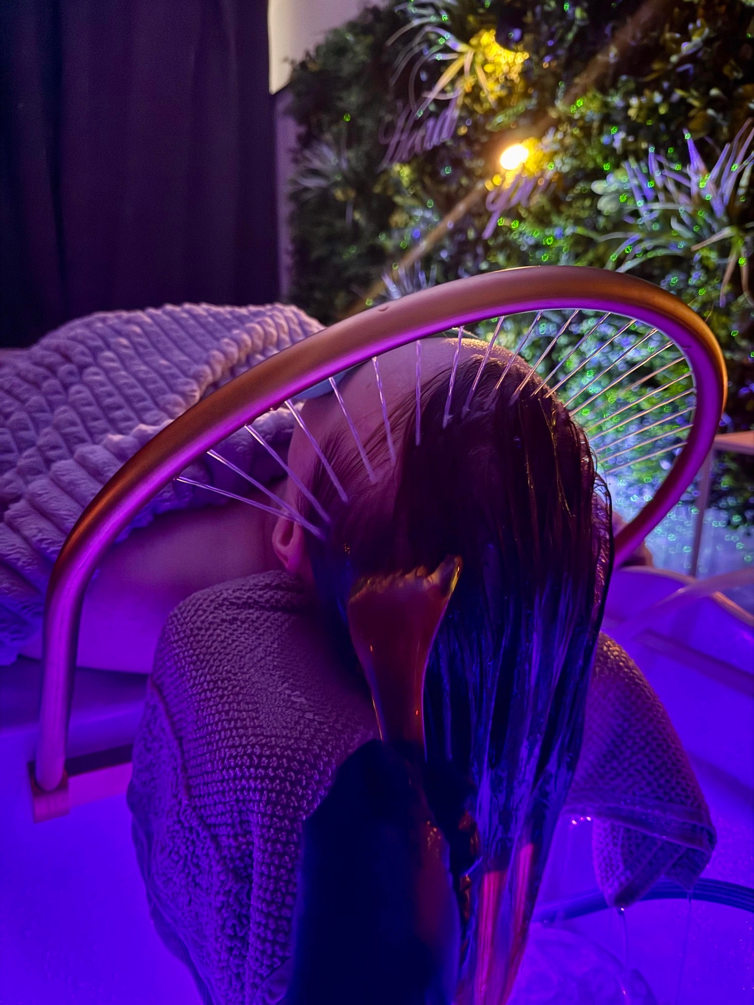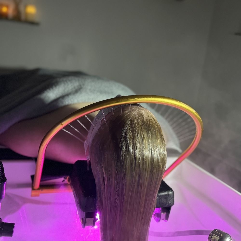 Náhled na pokožku hlavy přes trichokameru, následné zvolení péče postupu dle stavu pokožky a vlasu. Čištění pokožky hlavy bylinkovým peelingem Framesi, pleťová plátýnková maska s masáží obličeje, relaxační mytí vlasů s masážními přístroji, zážitková masáž hlavy a šíje kosmetikou Rituals, hydratační a výživný vlasový zábal Framesi, sérum na vlasy Framesi, masáž dekoltu bylinkovými měšci, bezoplachový kondicionér Malibu C, Tibetská zpívající mísa, projekce noční oblohy, sušení vlasů s pomocníkem Dyson Airstrait. V případě potřeby použití Zenz krému na obličej.